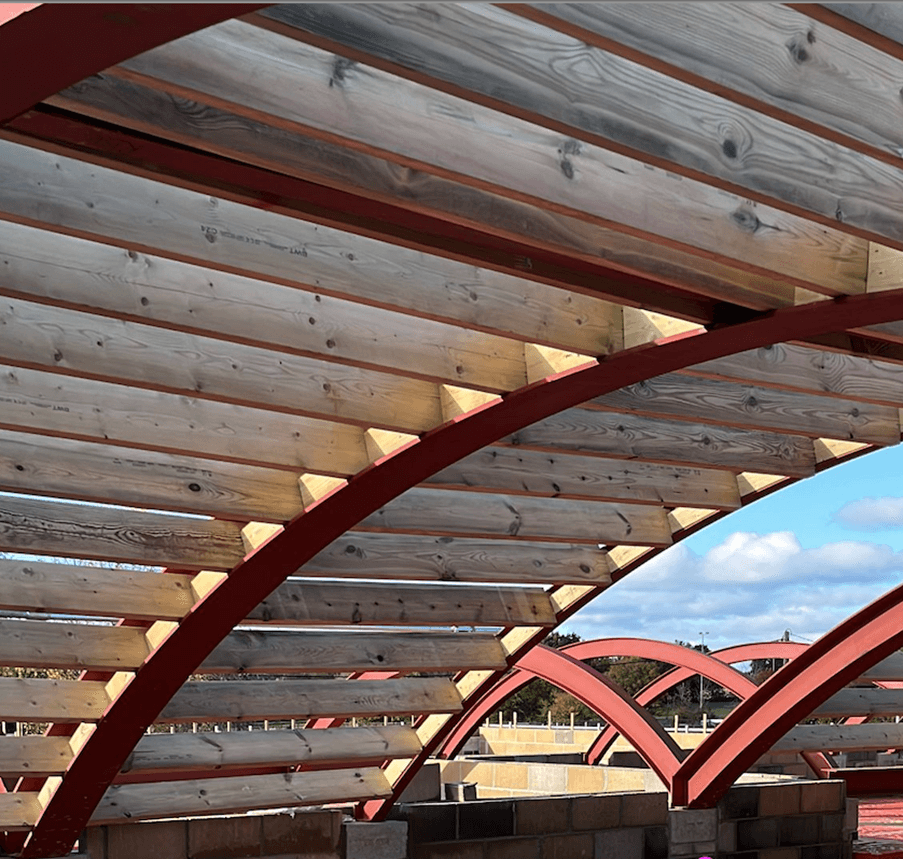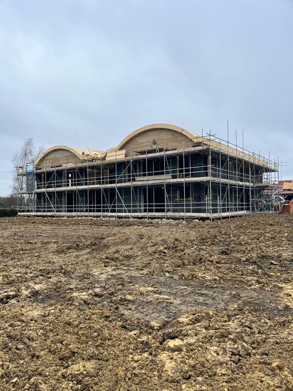 The steel framework was never intended to be integral to the structure of the building and the decision was made to proceed with a conventional cavity construction structure formed off of new mass concrete foundations. Timber joists would then form the first floor. Timber joists and 22 curved steels weighing circa 15 ton would be used to create the curved roof profile between the existing and modified steel trusses. Cavity masonry would also form the party wall structure separating the two dwellings.